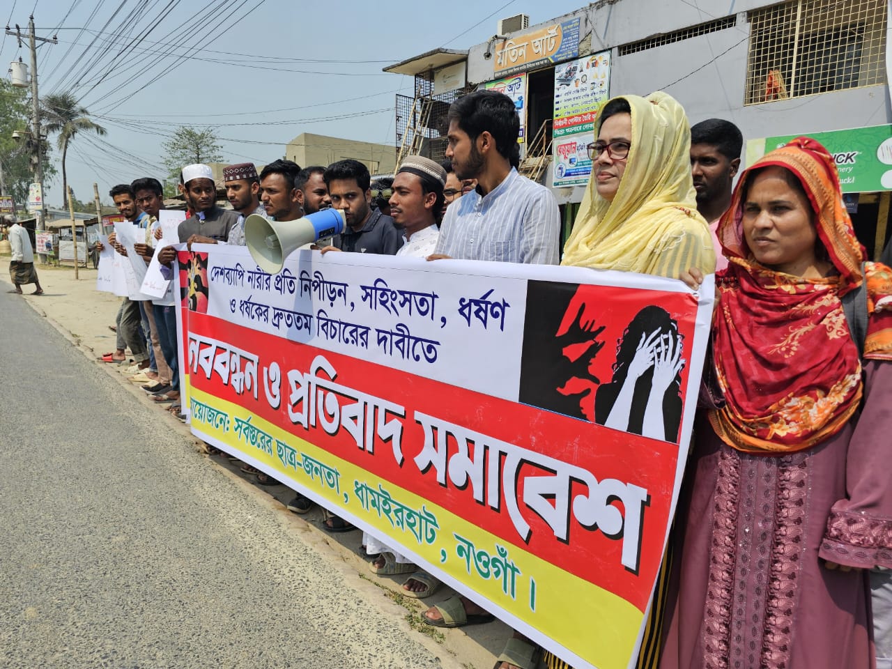নওগাঁর ধামইরহাটে উপজেলার সর্বস্তরের ছাত্র জনতার আয়োজনে দেশব্যাপী নারীর প্রতি নিপিড়ন, সহিংসতা, ধর্ষণ ও ধর্ষকদের দ্রুততম বিচার চেয়ে ফাঁসির দাবিতে মানববন্ধন ও প্রতিবাদ সমাবেশ করা হয়েছে।
