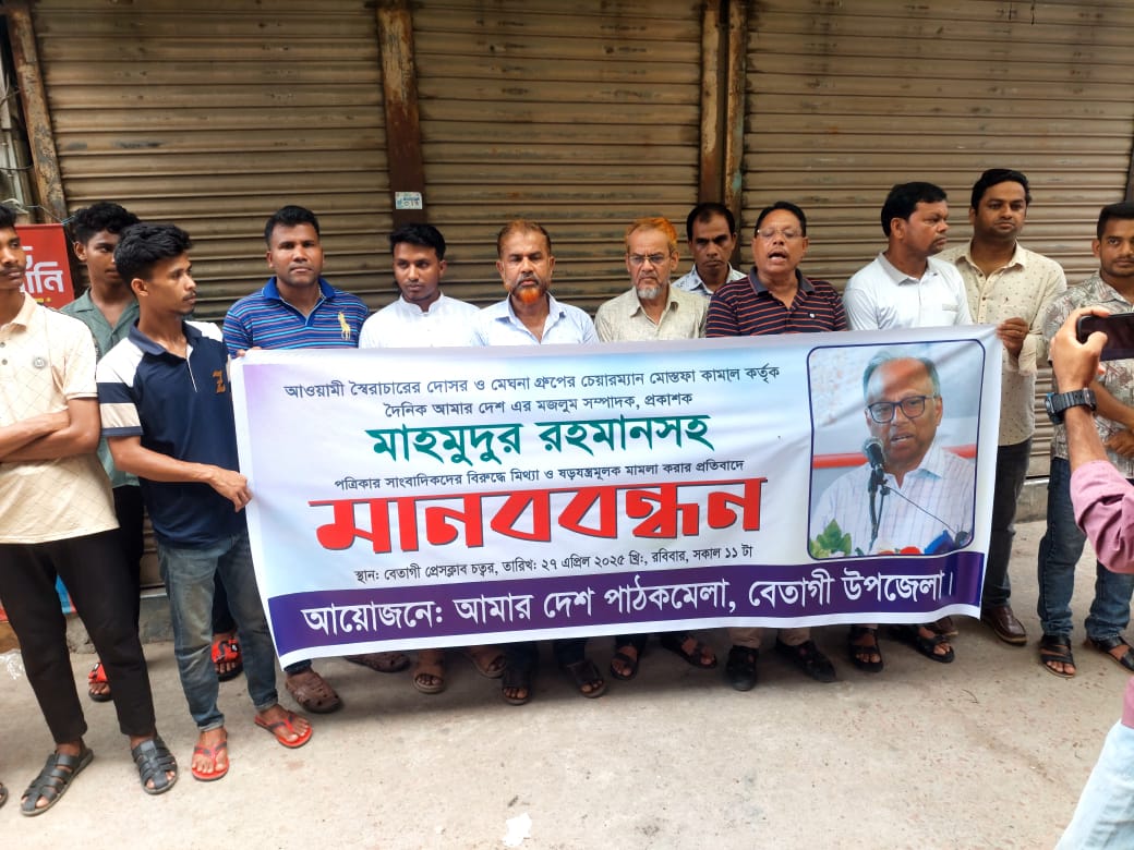 মানববন্ধনে সভাপতিত্ব করেন শাওন, আমার দেশ পাঠকমেলার বেতাগী উপজেলা সভাপতি। বক্তব্য রাখেন ফারুক হোসেন খোকন, নুরুল ইসলাম পান্না, মনিরুজ্জামান খান জুয়েল, জাহিদুল ইসলাম সাদ্দাম এবং আ. মালেক খাঁনসহ বিভিন্ন রাজনৈতিক সংগঠনের নেতারা। তারা মাহমুদুর রহমানের বিরুদ্ধে দায়ের করা মামলা অবিলম্বে প্রত্যাহারের আহ্বান জানান এবং দেশবিরোধী কর্মকাণ্ডে জড়িতদের আইনের আওতায় আনার দাবি জানান।