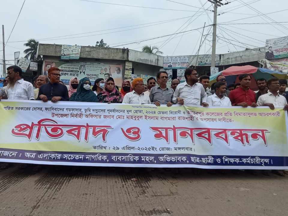 রাজশাহীতে ইউএনও কে অপসারণের দাবিতে বাগমারায় বিক্ষোভ মিছিল ও মানববন্ধন