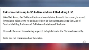 প্রতিবেদনে বলা হয়েছে, পাকিস্তানের তথ্যমন্ত্রী আতাউল্লাহ তারার বলেন, ভারত-শাসিত ও পাকিস্তান-শাসিত কাশ্মীরকে বিভক্তকারী নিয়ন্ত্রণ রেখায় গোলাগুলির সময় পাকিস্তানের সশস্ত্র বাহিনীর হাতে ৪০ থেকে ৫০ জন ভারতীয় সেনা নিহত হয়েছেন।