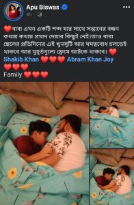 ঠিক এক ঘন্টা পর ঢালিউড কুইন অপু বিশ্বাস ও পুত্র আব্রাম খান জয় ও বাবার খুনসুটির কিছু মুহূর্ত শেয়ার করে লেখেন, “বাবা এমন একটি শব্দ যার সাথে সন্তানের বন্ধন কথায় কথায় প্রমান দেয়ার কিছুই নেই।তাও বাবা ছেলের প্রতিদিনের এই খুনসুটি আর মমত্ববোধ চলতেই থাকবে আর মুহূর্তগুলো ফ্রেমে আটকে থাকবে।” সঙ্গে জুড়ে দেন এত্তগুলো ভালবাসার ইমোজি আর শেষে লেখেন, ফ্যামিলি।