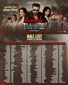 তবে বাংলা ছবিগুলোর মধ্যে শো-এর বিচারে আগাগোড়াই এগিয়ে শাকিব খানের ‘তাণ্ডব’। শুক্রবার সন্ধ্যায় হল লিস্ট ঘোষণা করেছে প্রযোজনা সংস্থা। বলা হচ্ছে, সমসাময়িক সময়ে সর্ববৃহৎ মুক্তি তাণ্ডবের। হল লিস্টের একটি পোস্টারে দেখা যায়, প্রথম সপ্তাহে দেশজুড়ে ১৩২ টি হল পেয়েছে তাণ্ডব। তার মধ্যে শুধু সিনেপ্লেক্সের ৬ টি শাখাতেই চলবে তাণ্ডব।
