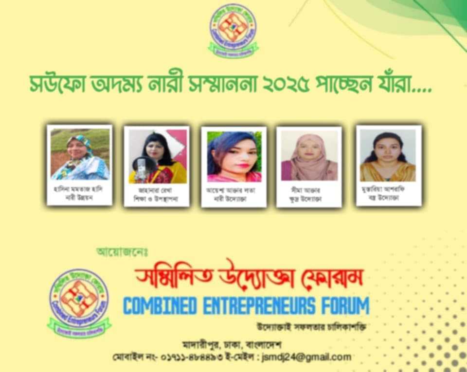 মোঃ শফিকুল ইসলাম নিজস্ব প্রতিবেদকঃ সম্মিলিত উদ্যোক্তা ফোরাম কর্তৃক আয়োজিত ‘সউফো অদম্য নারী সম্মাননা ২০২৫’ প্রদানের জন্য নারী উন্নয়ন, শিক্ষা