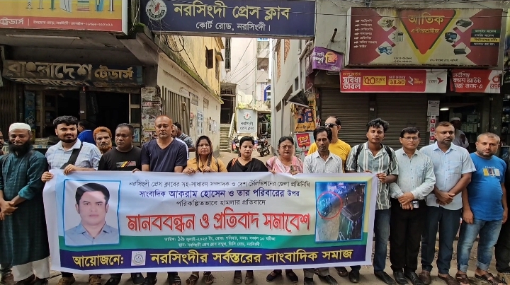 নরসিংদীতে দেশ টেলিভিশনের সাংবাদিক আকরাম হোসেন ও তার পরিবারের উপর হামলার প্রতিবাদে মানববন্ধন ও প্রতিবাদ সমাবেশ অনুষ্ঠিত হয়েছে। শনিবার (১৯
